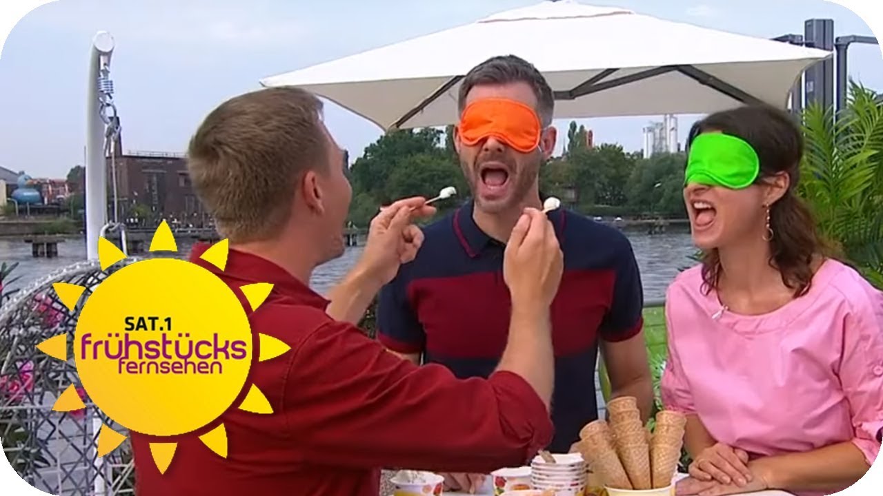 Reporter Lukas hat die verrücktesten Eissorten mitgebracht. Nun sollen die Moderatoren Marlene Lufen und Jochen Schropp mit verbundenen Augen erkosten, was Lukas für sie da mitgebracht hat.