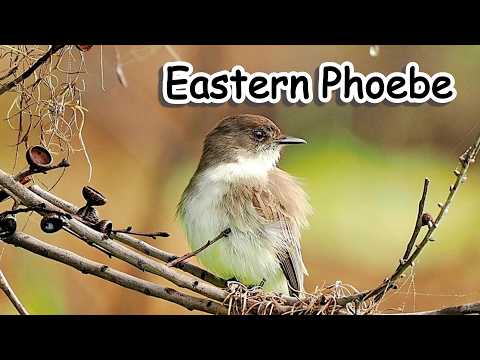 The Eastern Phoebe is a small, relatively big-headed flycatcher, that perches on brances and preys on flying insects and insects it spots on the ground.