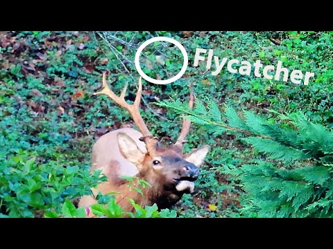 Amazing slice of animal life - watch closely as an Eastern Phoebe Flycatcher flies in to check out an elk for flies for a quick meal only to have the elk accidentally hit him with the tip of his antlers. Looks like this elk wasn't too fly infested, but its not unusual for flycatchers to hang around large mammals that might be covered in flies - ergo the name "Flycatcher". Check out the swarming flies covering this elk at the beginning of https://youtu.be/DaG9fkQsMKE. This is a win-win for the elk and Phoebe!