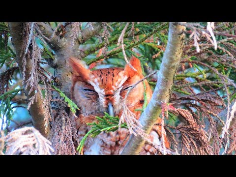 Mother screech owl is in the nest box sitting on three eggs which should start hatching around the end of March while Mr. screech owl roosts in a cypress tree overlooking the nest box so they can see and "talk" to each other through the day. Once its dark he starts hunting for food to feed Mom.